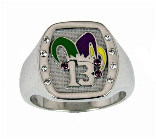 This is a beautiful solid stainless steel Royal Order of Jesters Ring featuring a number 13 to commemorate the original 13 Shriners who, in 1911 got together and formed the Royal Order. The number 13 is adorned with a beautiful Jester Crown and is accented with clear and purple rhinestones. This ring is also available in a steel gold tone color, item number T115. Comes in a nice gift box.