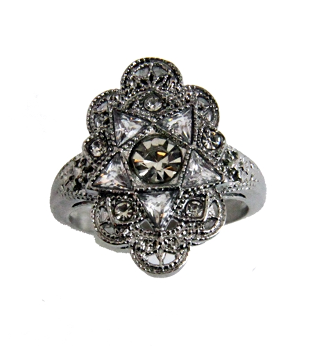 This is a gorgeous stainless steel OES Order of Eastern Star ring featuring a beautiful filigree design. The points of the star are clear faceted triangular rhinestones and it has brilliant round accent rhinestones throughout. This ring is also available in a gold tone stainless steel with clear stones, item #T152. This same ring is available with multi color triangular rhinestones, item #T153, as well as a gold tone stainless with multi color triangular stones, item #T154. Finally, we have the same ring for past matrons, with a gavel, item #T167 and T168. This ring will come in a nice gift box.