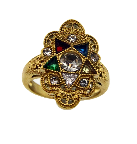 This is a gorgeous stainless steel OES Order of Eastern Star ring featuring a beautiful filigree design. The points of the star are multi color faceted triangular rhinestones and it has brilliant round accent rhinestones throughout. This ring is also available in a silver tone stainless steel with multi color stones, item #T153. This same ring is available with clear triangular rhinestones, item #T151, as well as a gold tone stainless with clear triangular stones, item #T152. Finally, we have the same ring for past matrons, with a gavel, item #T167 and T168. This ring will come in a nice gift box.