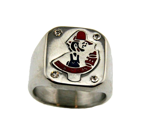 This is a Stainless Steel Hillbilly Ring, made of solid stainless steel. Features a nicely detailed Hillbilly with a moonshine bottle on the face, along with a clear rhinestone in each of the four corners of the top of the ring. We also have it in a gold tone stainless steel, item number T162.